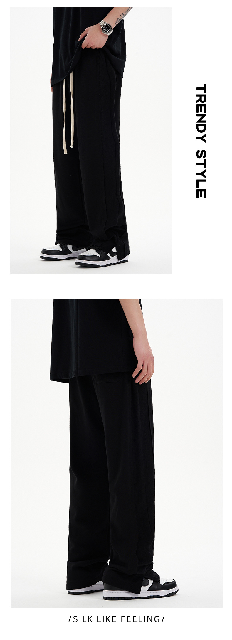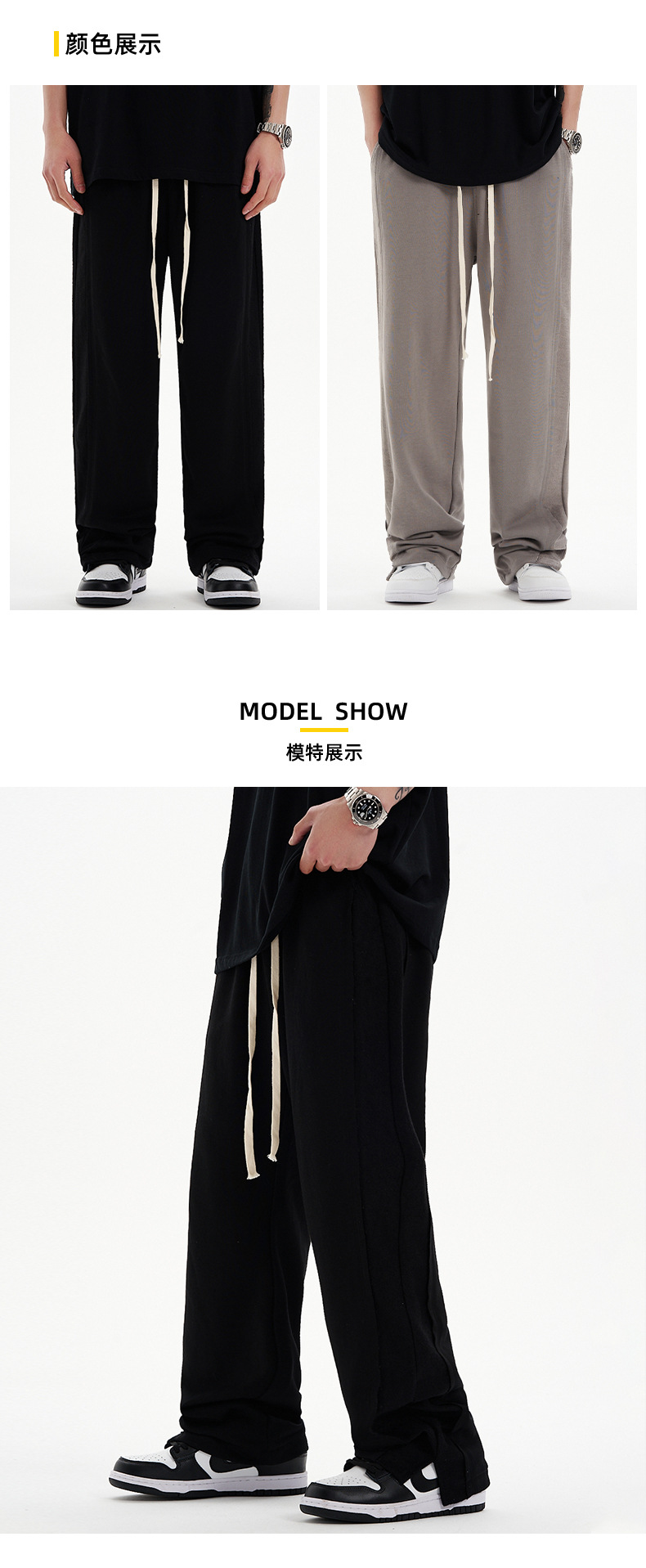 高街直筒休闲裤男秋季美式抽绳开叉卫裤潮牌宽松垂感纯色拖地长裤