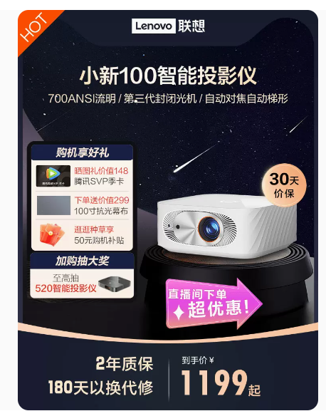 联想小新100智能投影仪家用投墙投影机1080P超高清