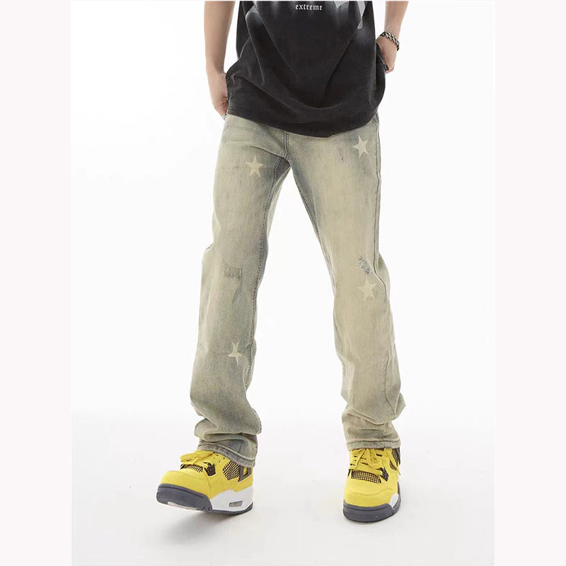 水洗黄泥染复古星星印花牛仔